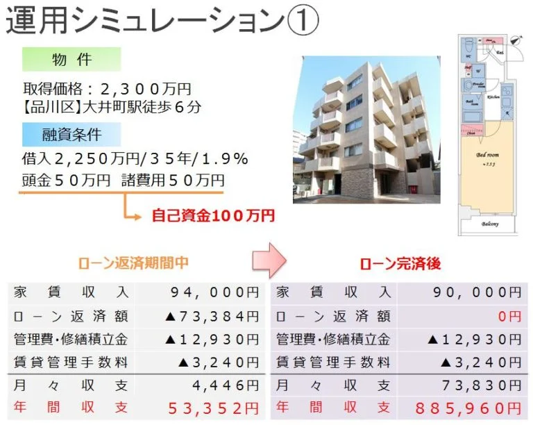 物件:品川区大井町駅徒歩6分・築13年 取得価格:2,300万円 融資条件:借入2,250万円・期間35年・金利1.9% 初期費用:合計100万円(頭金50万円・諸費用50万円) |
