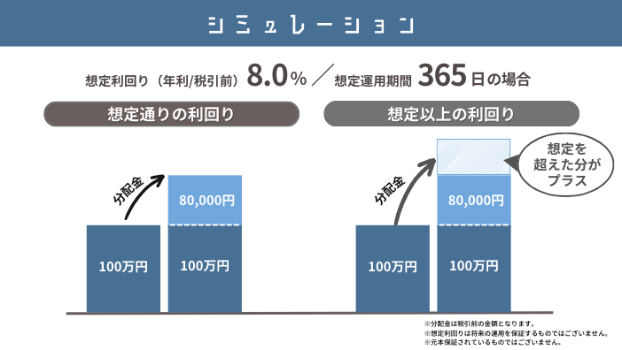 他社よりも高い5~10%の高配当で、これまで28%といった利回りが上振れした実績もあります。