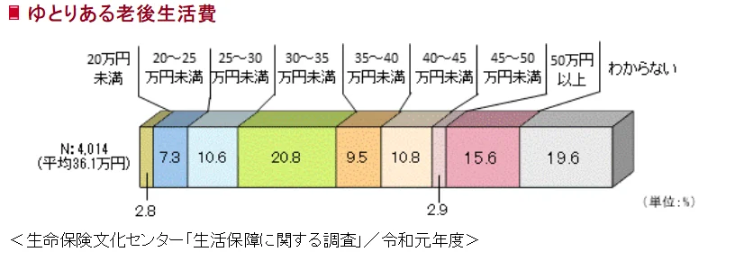 生命保険文化センター「生活保障に関する調査(令和元年度)」によると、「ゆとりある老後生活費」の月額平均額が36.1万円。