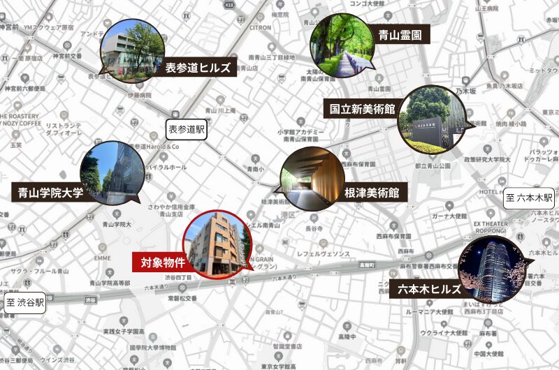表参道駅から骨董通りを進むと、オシャレなカフェやセレクトショップ、ギャラリーが並ぶ落ち着いた街並みが広がり、物件へと続きます。駅周辺は賑やかですが、少し歩くと小さな事務所や店舗が点在するエリアとなり、適度な人通りと静けさが共存しています。利便性と穏やかな環境のバランスが取れた、散策も楽しい魅力的なロケーションです。
