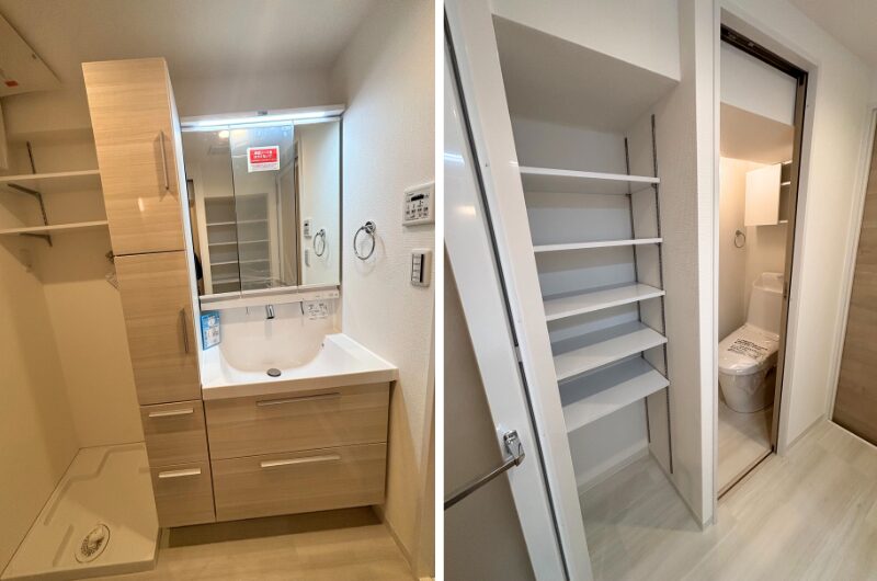 洗面台横のサイドキャビネットは、浴室と共通の配管ルートに合わせて左側へ配置。配管の勾配を最適に保ちながら、日用品を取り出しやすい実用的な収納となっています。