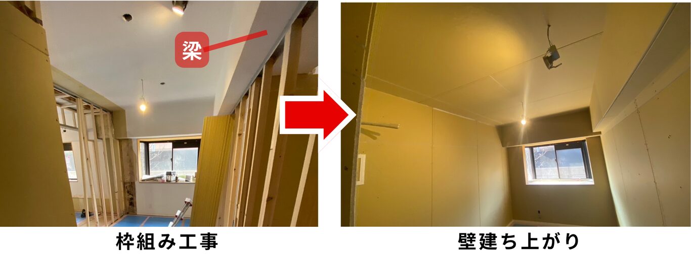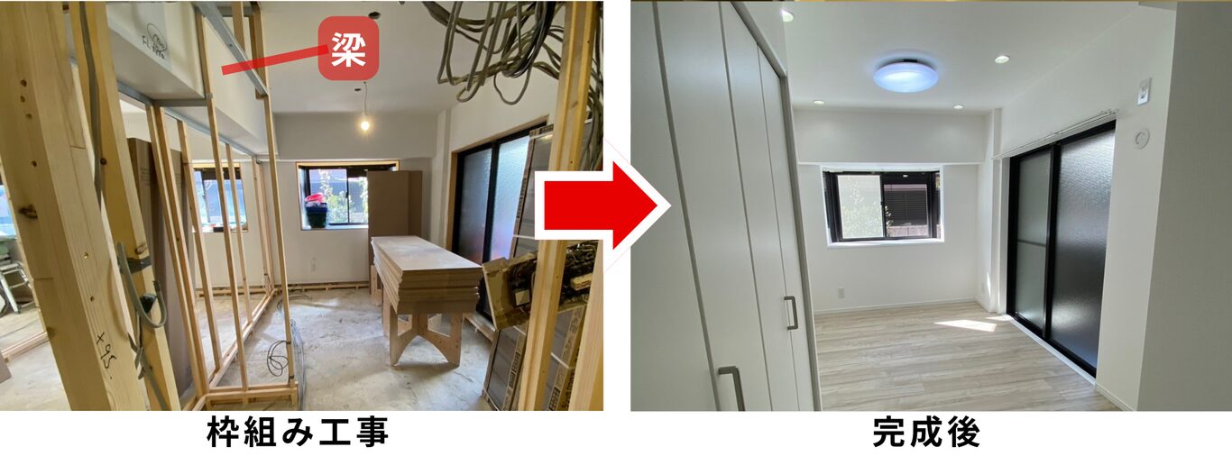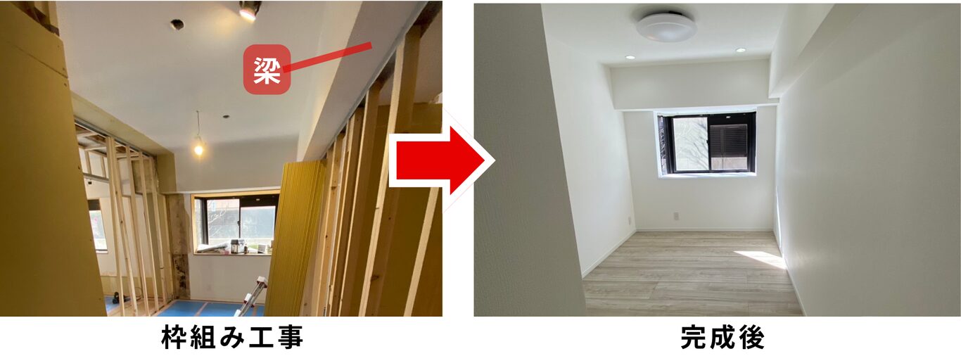 もともと1つの居室は真ん中の梁に合わせて壁を設けて、2つの居室になりました。
