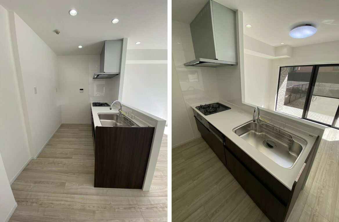上記にあったように居室が1つから3つになりましたが、リビングの開放感は落としません。キッチンは壁につけずカウンターキッチンを採用することで、リビングが抜けて見えます。