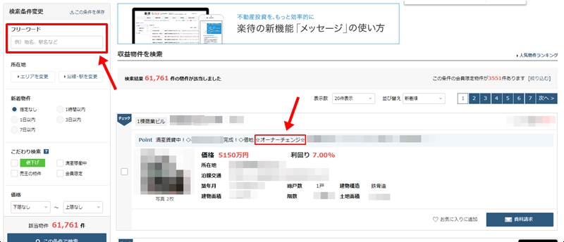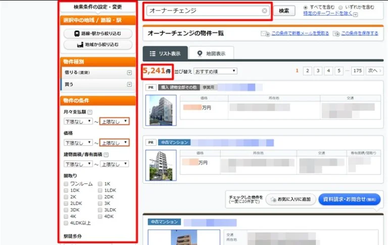 また、左側のフリーワードに「オーナーチェンジ」と入力しつつ、条件を絞って検索しても良いでしょう。