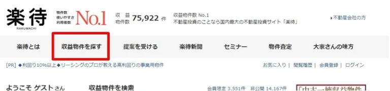 まず下記のURLにアクセスして「収益物件を探す」をクリックしましょう。