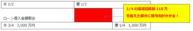 黄色の部分、夫から妻へ1/4の1,000万円が「贈与」とみなされ贈与税がかかります。