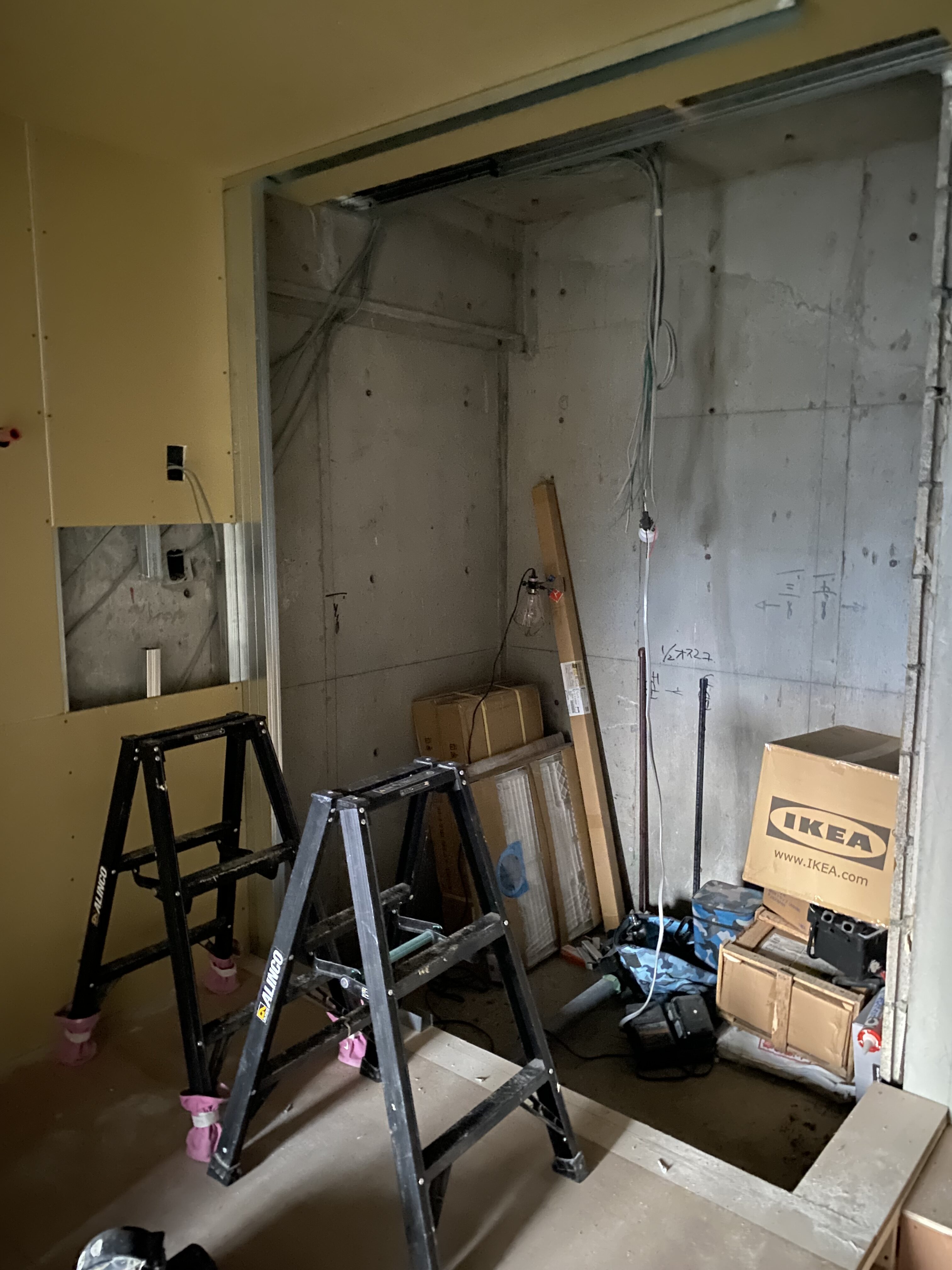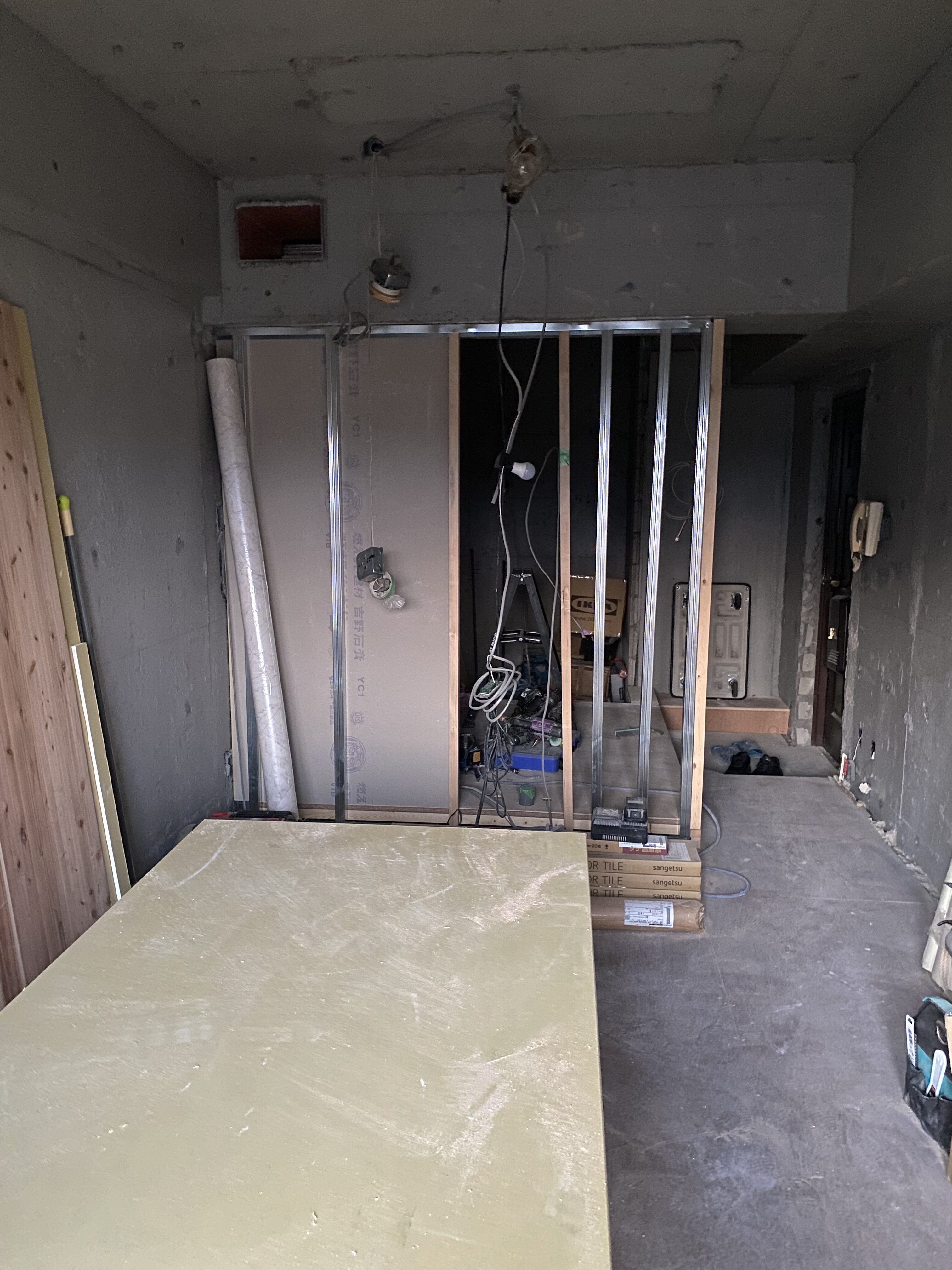 洗濯機置き場・バストイレがあったスペースと居室の間には新たに壁ができ、全体の形が見えてきました。