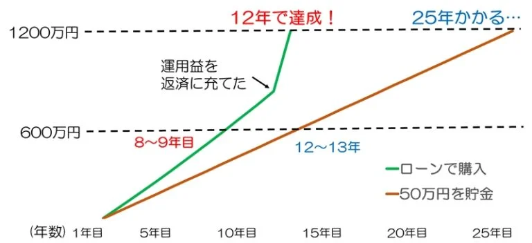 何千万円という不動産をお金が貯めるまで待つ必要もなく、さらにそれよりも資産をつくるスピードが速くなります。