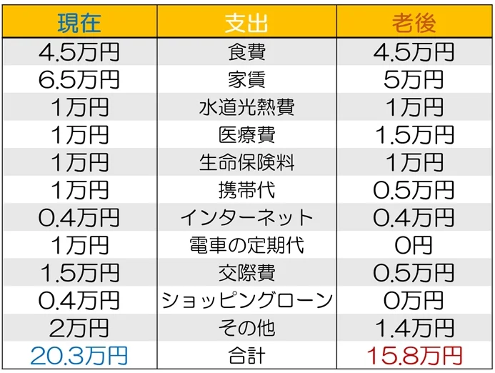 そこでまず、先ほどご紹介した私の生活費が、老後を迎えた時にどのように変化しそうかまとめてみました。
