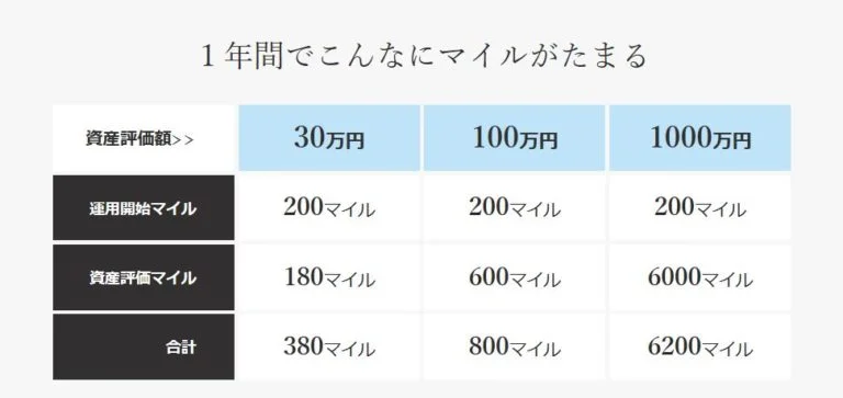 開始時、300マイル付与。 年間マイル上限なし。 資産評価額1万円につき、毎月0.5マイル付与。 3,000万円をこえる場合は 資産評価額1万円につき、毎月0.25マイル付与。 |