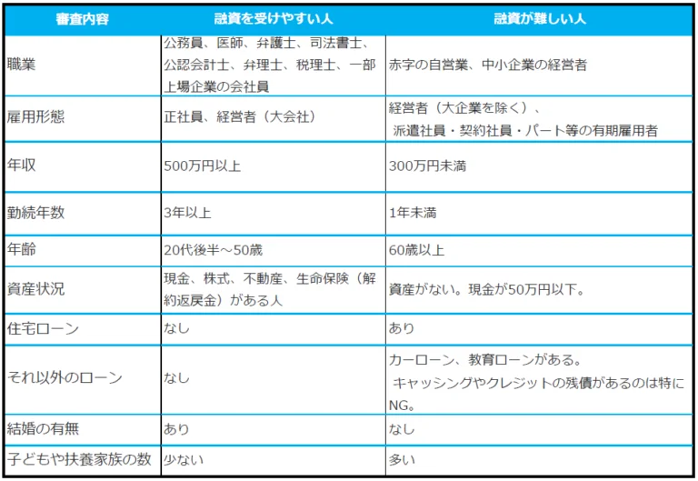 では、どのような基準で融資を受けやすい人なのか融資が難しい人なのか表でまとめてみましたのでみていきましょう。