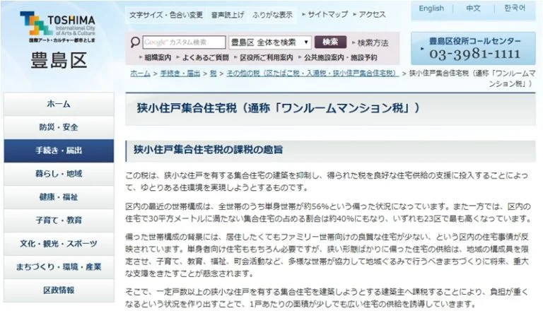 ≫豊島区「狭小住戸集合住宅税(通称「ワンルームマンション税」)」