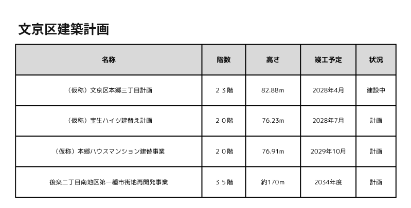 文京区は文教地区として落ち着いた街並みが保たれており、建築制限の影響で他区に見られるような大型複合施設の開発は抑えられています。