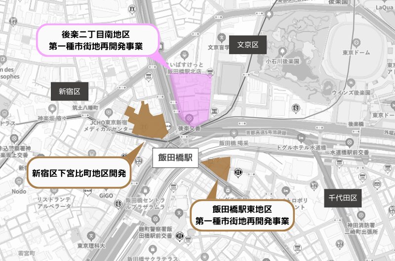 その他、南東側の千代田区側では「飯田橋駅東地区第一種市街地再開発事業」が2026年度竣工予定で進められています。