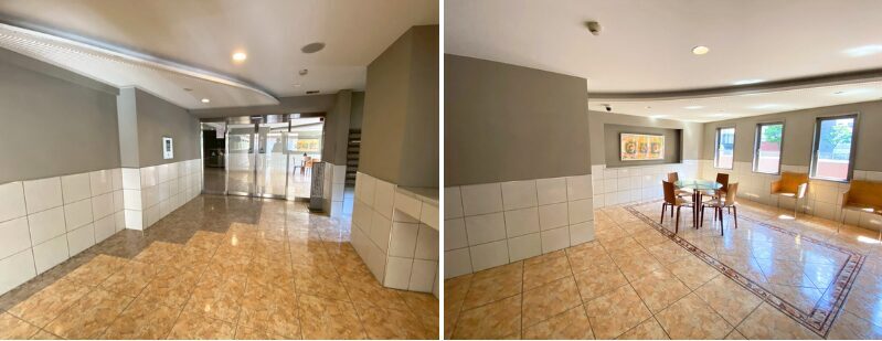 エントランスは広く明るく、高級感のある造りです。共用スペースにはテーブルと椅子が設置されており、ちょっとした作業や休憩にも利用できます。