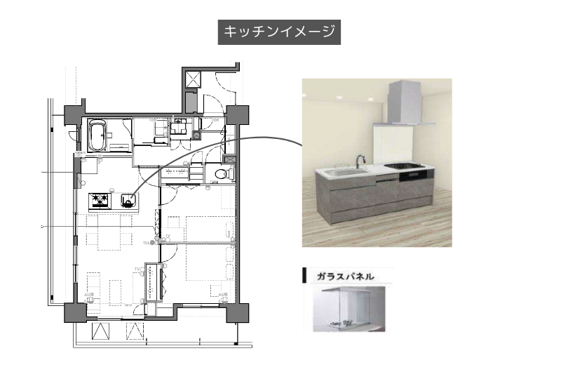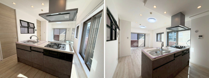 1LDKから2LDKへの改修に際し、最も検討を要したのがキッチンの配置でした。窓が多い構造上、壁付け形式が採用できず、カウンター型やセパレート型も条件面および需要面から採用を見送りました。