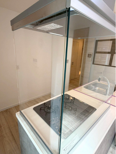 通常仕様では対応が難しいため上位グレードへ変更し、さらにキッチン横には特注の防火ガラスを設置することで、窓近くでも安全性と意匠性を両立します。