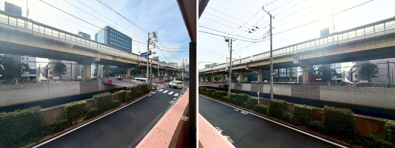 神田川と首都高速道路に面した立地にあり、低層階はレンガタイル、中層階以上はオフホワイトと、重厚感のある印象的な外観が特徴の建物です。角地に位置しているため、開放感も感じられます。