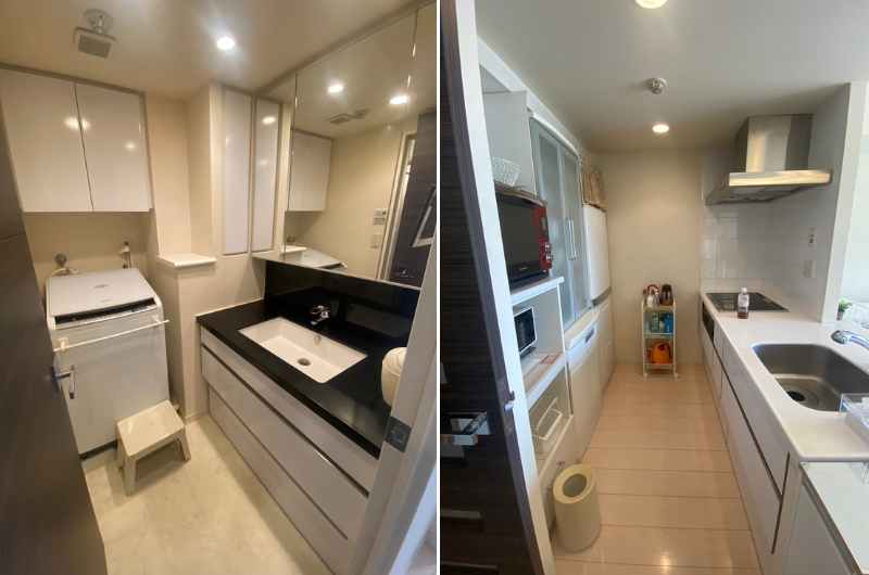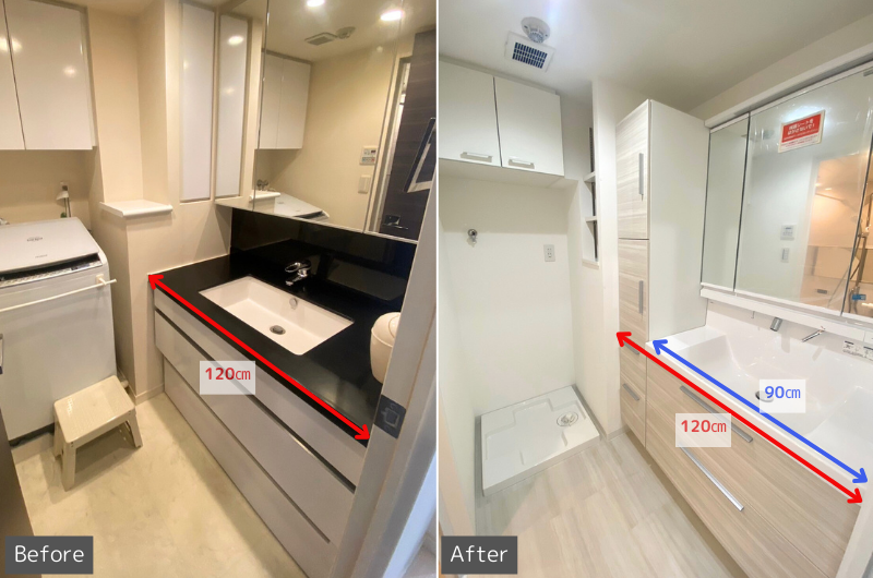 洗面台は大きく幅1.2mありましたが、最適な大きさの幅0.9mに変えてトールキャビネットを設置し、収納力不足を補てんします。