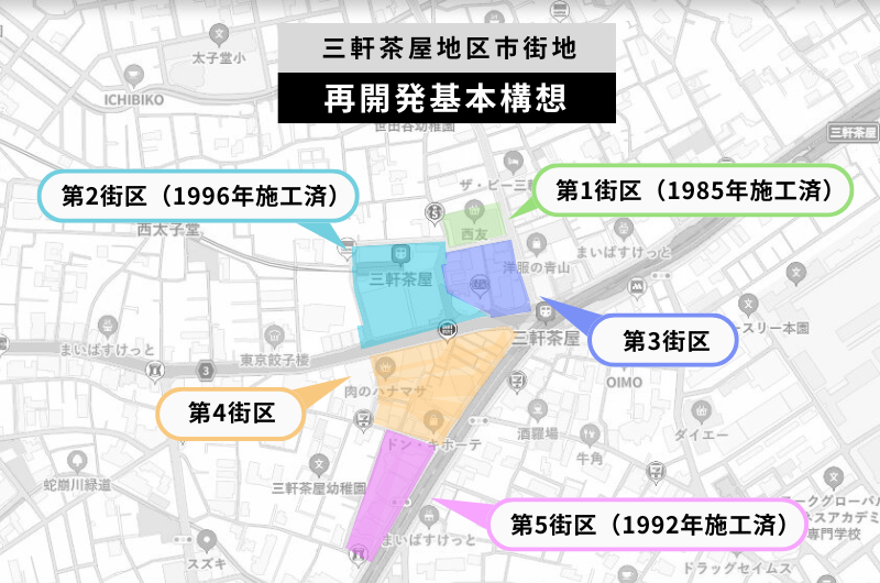 当時策定された<三軒茶屋地区市街地再開発基本構想>に基づき、駅周辺を5つの街区(エリア)に分けて再開発が進められています。