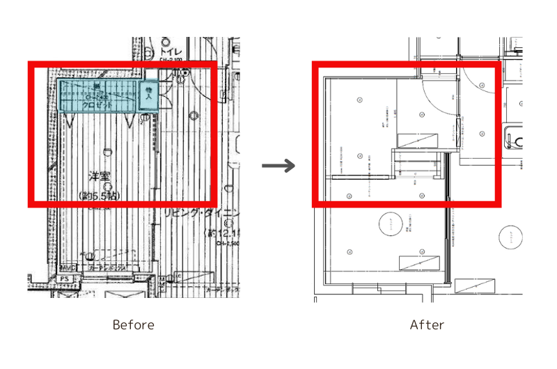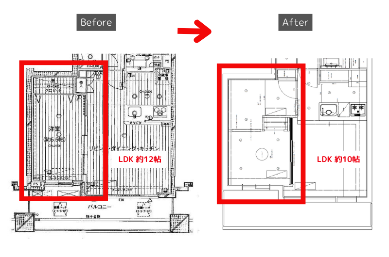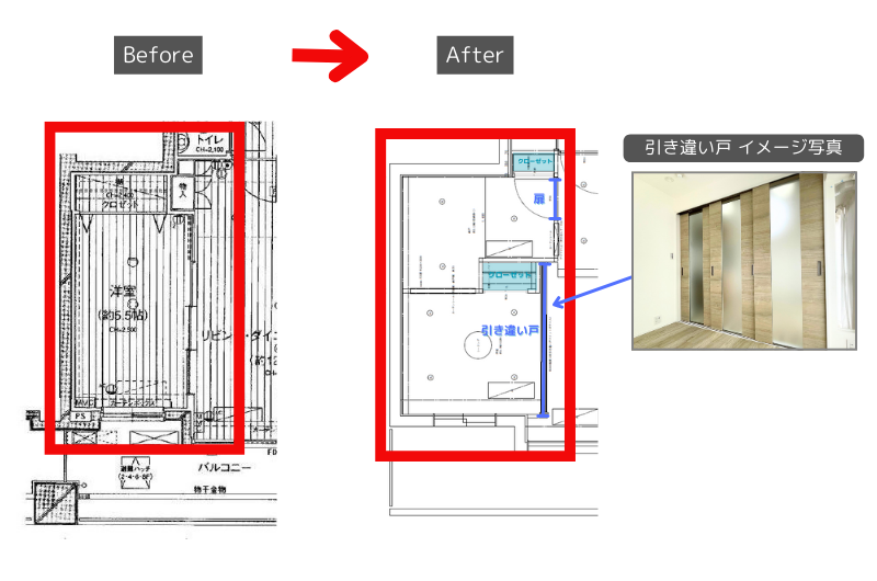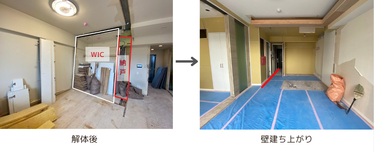 WICと納戸があった箇所を3帖以上の居室として利用できるように、居室の壁をLDK側へ広げました。