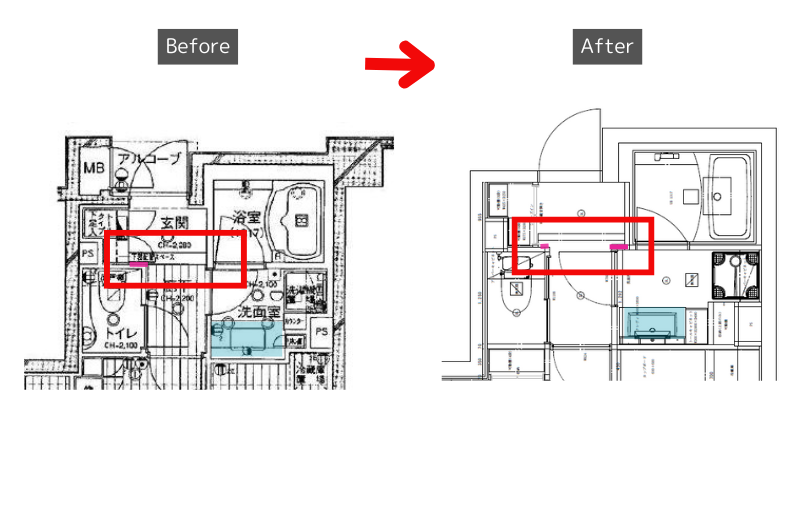 また、トイレには元々手洗い場がありましたが、この手洗い場を撤去し75㎝の幅に縮小し、そのぶん洗面室を広くします。