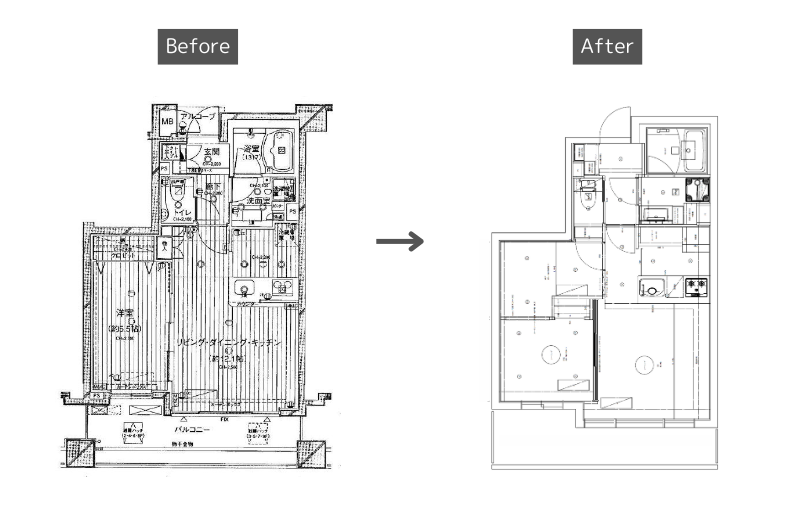 世田谷公園が近く、ペットと一緒に住みたい人には希少なエリアにあるこのマンションを、現行の間取りの1LDKから2LDKに変更することで、単身者だけでなく2人入居や、ファミリー層にも応用が利く間取りに変更します。