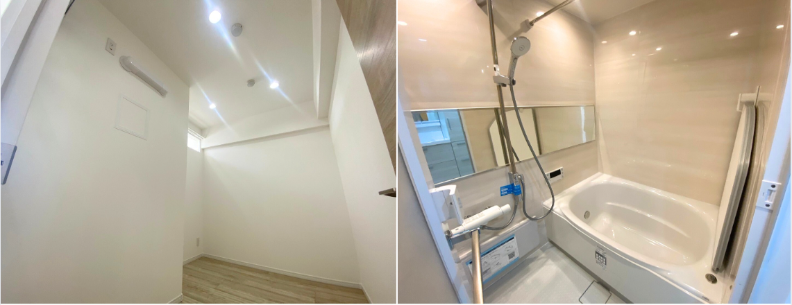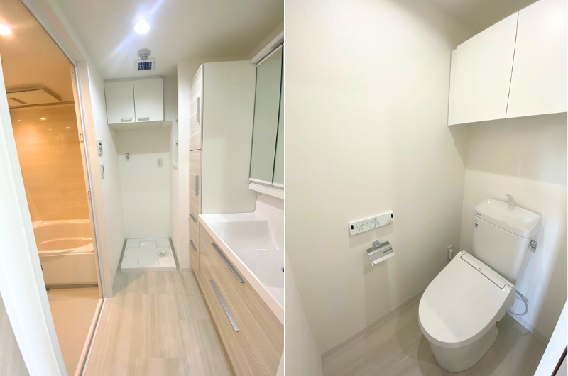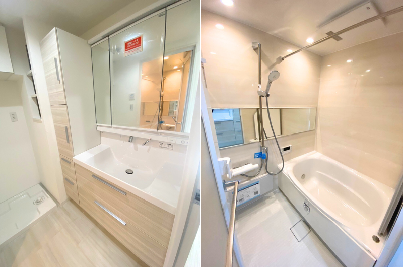 明るい色でまとめられた浴室と洗面室は、清潔感がありスッキリまとまって視覚的に広がりを感じさせます。