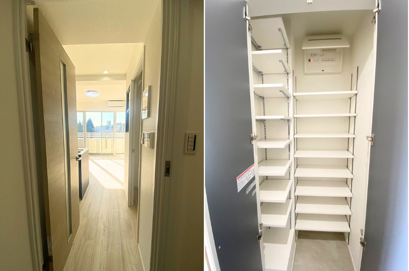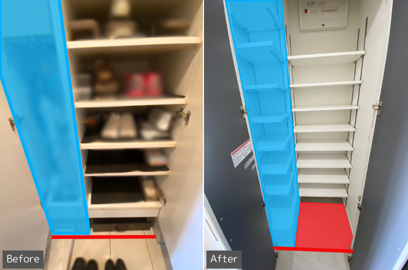 また、玄関収納も解体後に使っていなかったスペースがあることが判明し、実質シューズインクローゼットの様に奥行きのある玄関収納ができました。