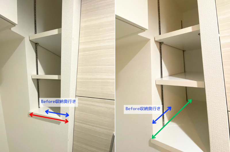 解体後、洗面台横のカウンター・壁収納部分に想定プラン以上のスペースがあったことが判明しました。この部分にはスペースを最大に生かした収納棚を造作し、これまでの収納より奥行きのある収納棚を設置することができました。
