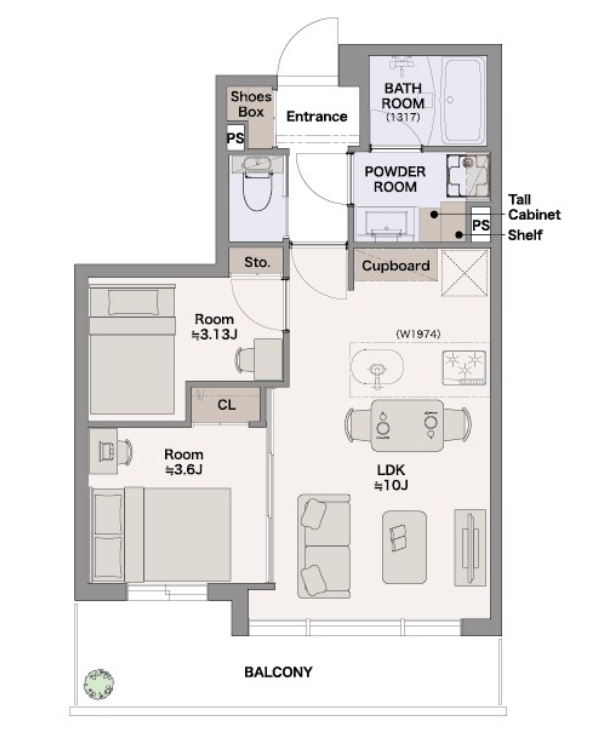 単身者には一室をウォークインクローゼットとして利用ができるように、また2~3人でお住まいの時は2つの居室を寝室に利用できるように、使い分けのできる2LDKに変更していきます。