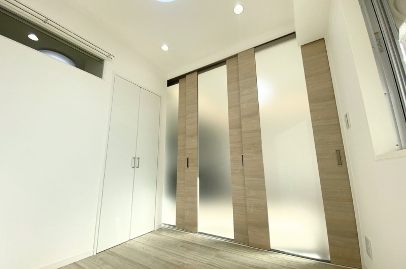 この引き戸には採光が取れる様に、スリットガラス入りの扉を使用します。さらに、3連引き違い戸を使用するので、左右自由に開口できて空間の自由度が高くなります。