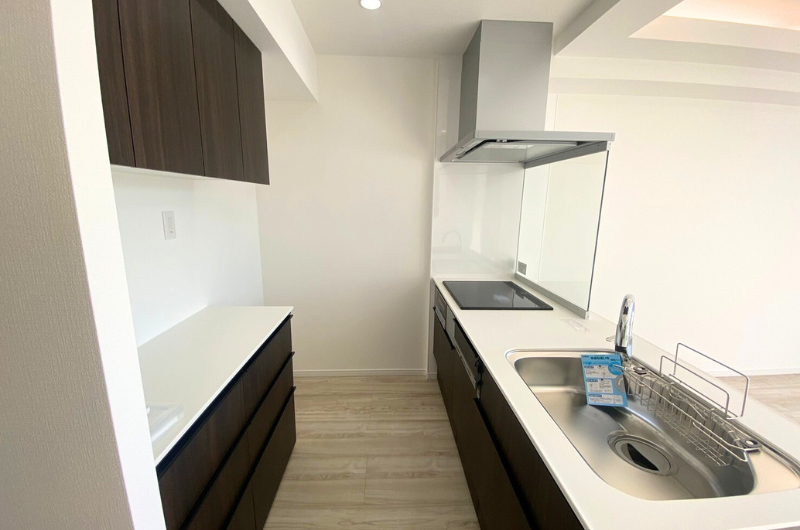 IHクッキングヒーターとガラスパネルのため、キッチン自体もスタイリッシュにまとまっています。キッチン収納も多く調理器具や食器も全て収まり、すっきりした見た目をキープできます。