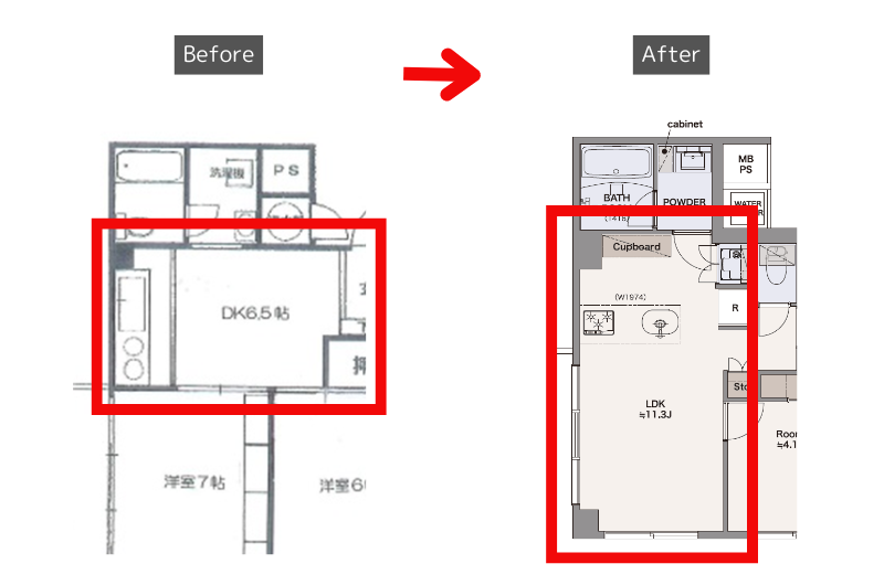 Plan 1. 2DKから1LDKへ変えて開放感のあるLDKづくり