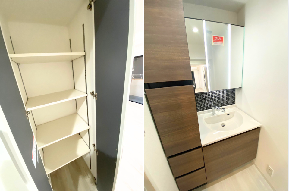 洗面室にはトールキャビネットを設置しているので、洗面室や浴室で使用するものはここでの収納で収まります。前述したキッチンにもカップボードが設置されるので、収納スペースは十分確保され、生活感のない空間がつくれます。