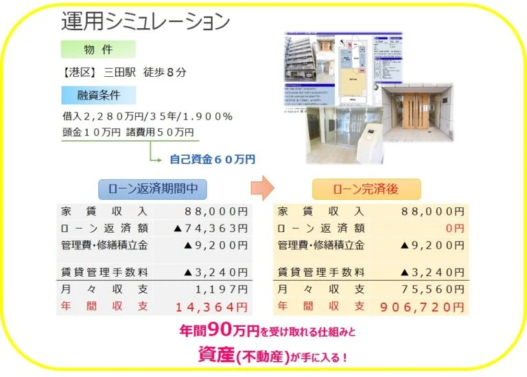 上記で紹介した東京都心の中古マンションを融資利用して運用した場合でご説明します。