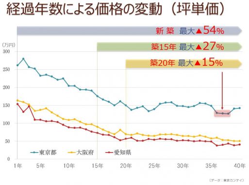 逆に築15年目以降は大きな価格の値下がりはなく、横ばいである傾向です。