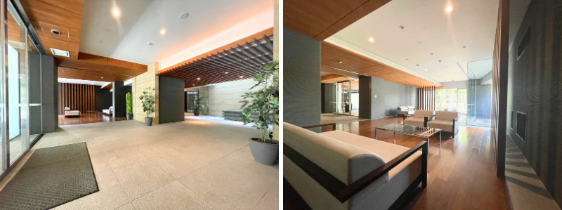 壁面には重厚感のある素材が用いられ、ホテルライクで洗練された共用空間が広がっています。