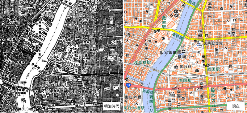 現在でも両国国技館を中心に相撲の街として知られ、隅田川 の水辺や公園とともに、歴史と文化を身近に感じられる街並みが残されています。