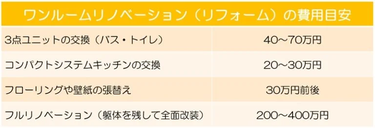 下記は、ワンルームのリノベーション費用の目安です。