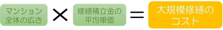 マンションの大規模修繕で、必要になる費用の目安は、上図の表と下図の計算式で簡易的に求めることができます。