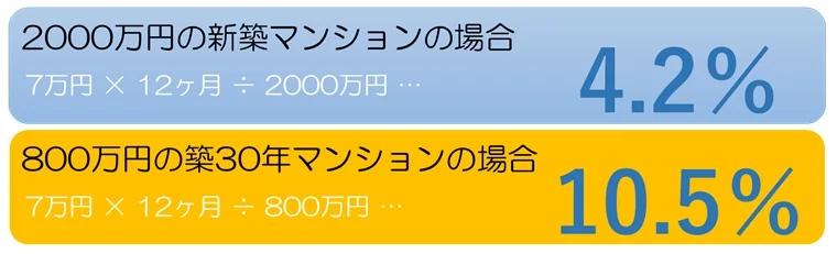 ここで、家賃7万円の単身者用マンションを購入したと仮定して、2000万円の新築と、800万円の築30年マンションの購入価格で、どのくらい利回りに違いがあるのか計算してみましょう。