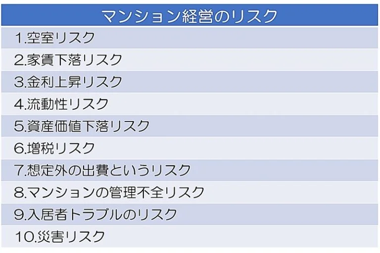ここでは、マンション経営につきまとうリスクで、代表的なものを10個あげてみました。
