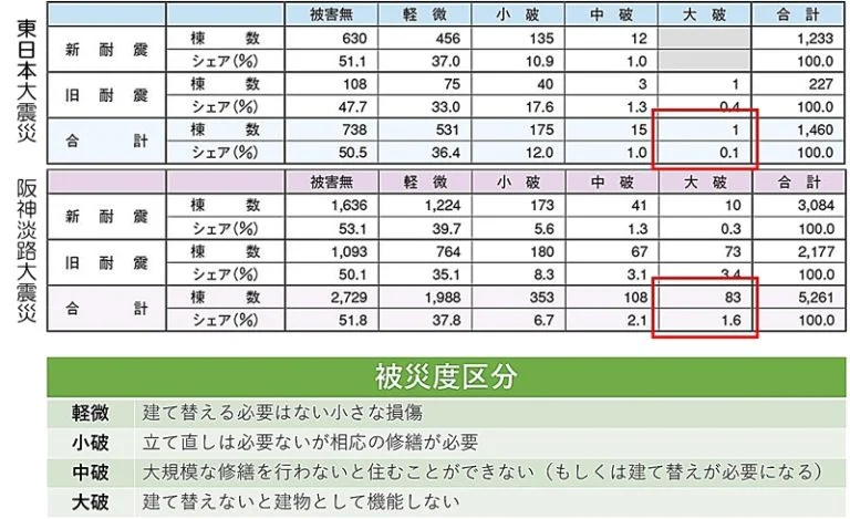 東日本大震災では大破したマンションは全体の0.1%ですが、阪神淡路大震災では新・旧の耐震基準の建物を併せ、全体の1.6%で建て直しが必要なほど損傷しています。