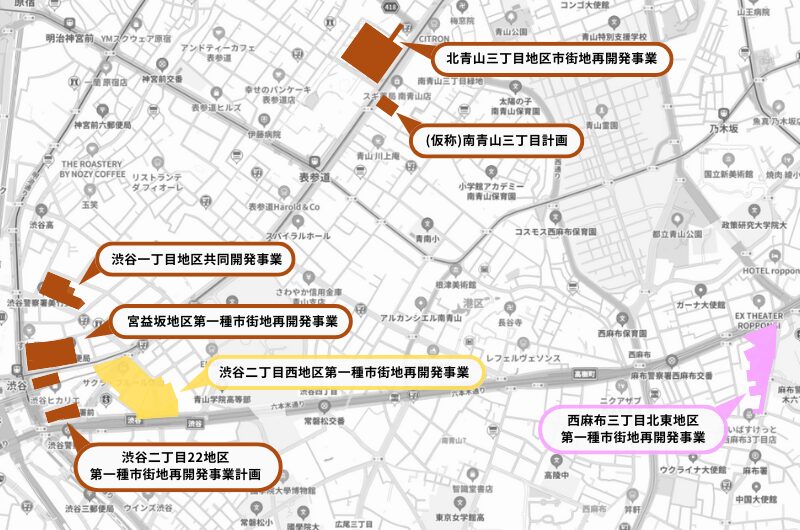 南青山周辺の表参道や渋谷、六本木では大規模な再開発が進行しています。
