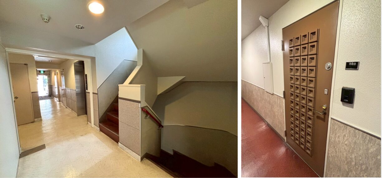 共用廊下は赤い床が印象的な内廊下仕様で、各戸の玄関ドアには彫り模様が施された木製ドアが使われていて、レトロな雰囲気が漂います。
