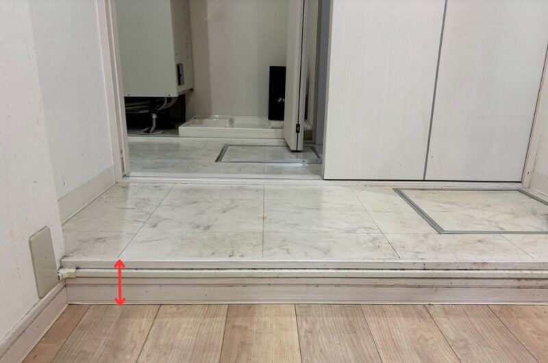 この物件では、水回りに大きな段差があり、これがリノベーションにおける大きな課題となります。配管を通す必要があるため、完全にフラットな床にはできませんが、工事により段差をできるだけ縮めるよう対応していきます。