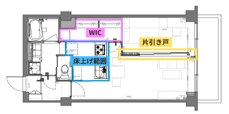 給排水管を通すには傾斜が必要となるため、どの位置から配管するかを検討した結果、床の高さを最小限に抑えられるWIC側から給水をとることにしました。