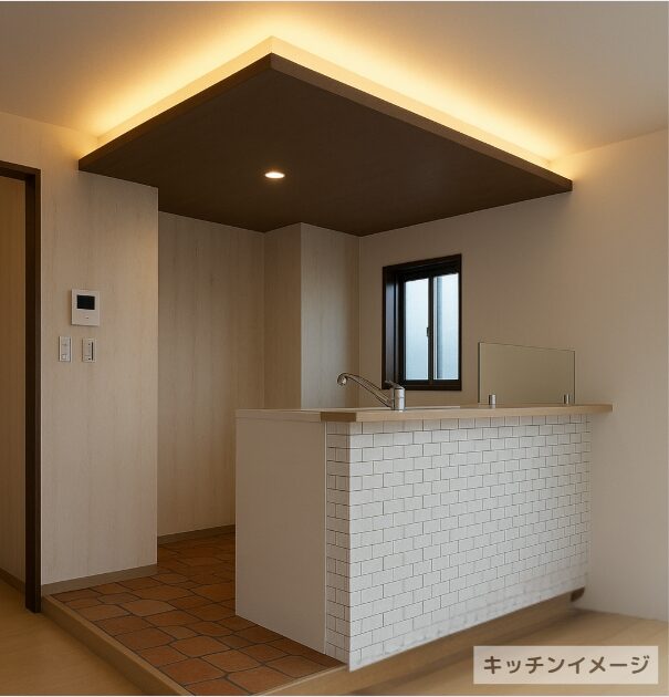 配管の都合により、キッチンの床を一段高くしたプランで設計を進めていきます。さらに、配管ダクトの設置によって天井高が下がるため、照明によって空間に工夫を加えます。キッチン上部には間接照明を取り入れ、洗練された雰囲気を演出します。
