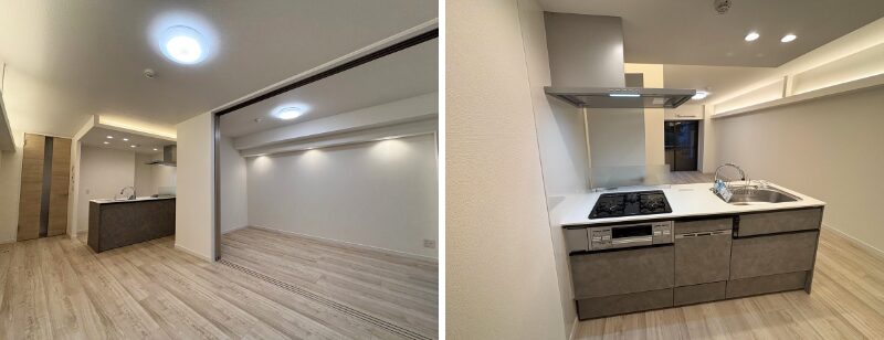 今回のリノベーションの大きな課題となっていた段差の解消ですが、給排水管を通すための勾配は床を上げなくても確保できることが分かり、キッチンの床上げは不要となりました。その結果、LDK全体がフラットな床となり、暮らしやすさが一層高まります。